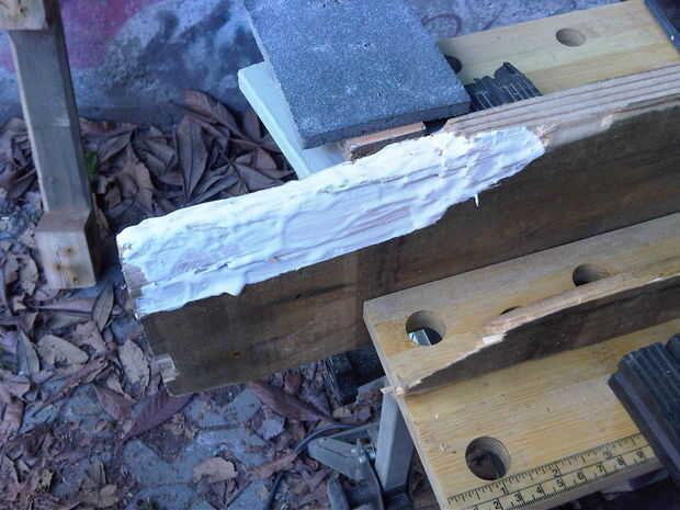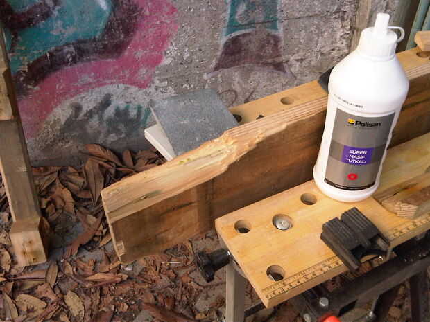 Utilicé cola de madera blanca estándar para unir los trozos juntos. Pegamento para madera a base de agua (PVA, acetato de polivinilo), por lo tanto se seca en 2 a 4 horas pero el Consejo de instrucciones no trabajar a máquina las piezas remendadas antes de 24 horas. Una gran ventaja de este pegamento es que se vuelve transparente cuando se seca y es muy fácil de quitar con un cincel o un papel de lija.