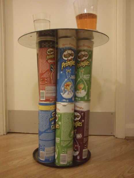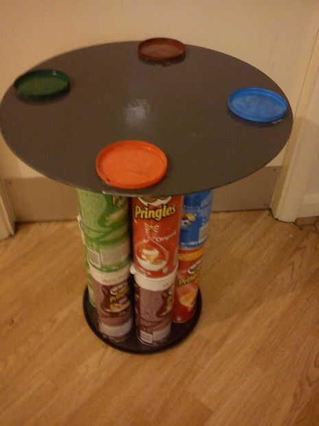 El siguiente paso es aplicar una capa uniforme de pegamento en cada una de segundo nivel puede tapas de Pringle; la superficie de la mesa luego se pegar a esto. Con el lado reflectante del espejo hacia abajo, presione hacia abajo en el segundo nivel de soporte y sujete en su lugar por unos 30 segundos.