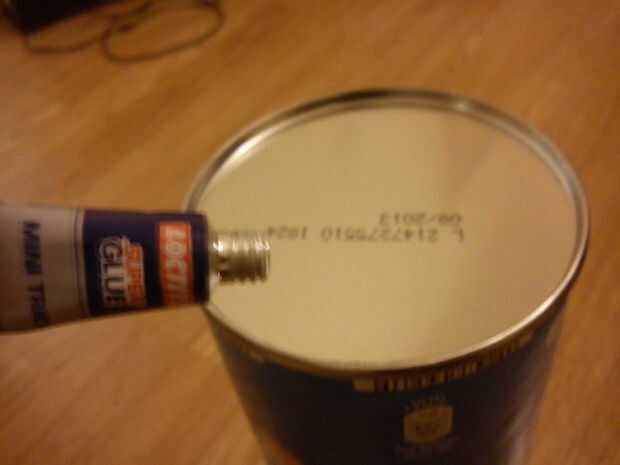 Asegúrese de tener su base de pizza listo y luego recoger tu pegamento. Exprima una fina capa de pegamento y la cubierta el labio de la base de la Pringle puede y presione firmemente sobre la pizza base para garantizar.