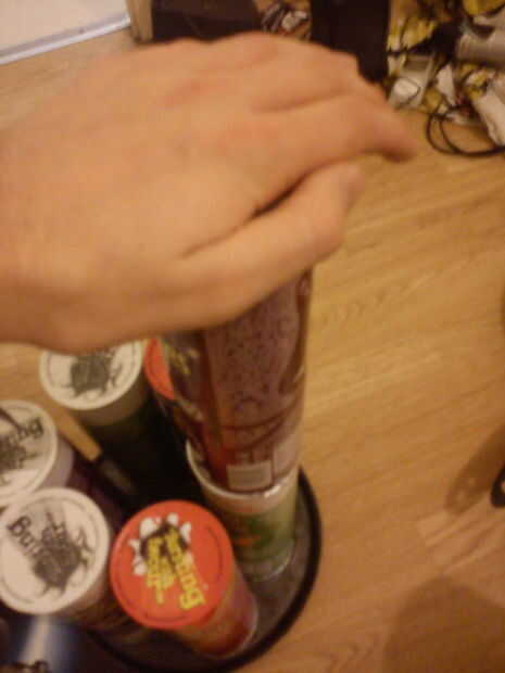 El exacto mismo proceso necesita ser completado para el segundo nivel de la mesa de café. Así que simplemente añadir una fina capa de pegamento para el labio en la base de la lata y aplique presión al pegarse a la parte superior de las otras latas de Pringle.