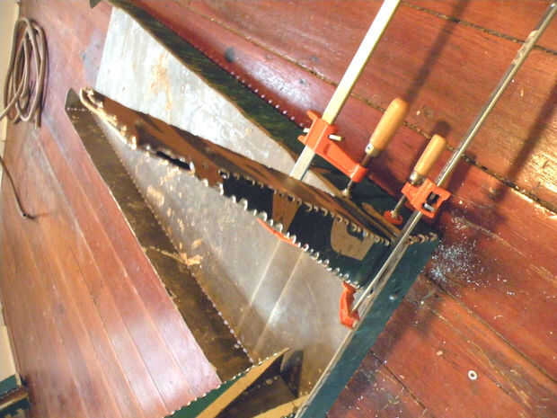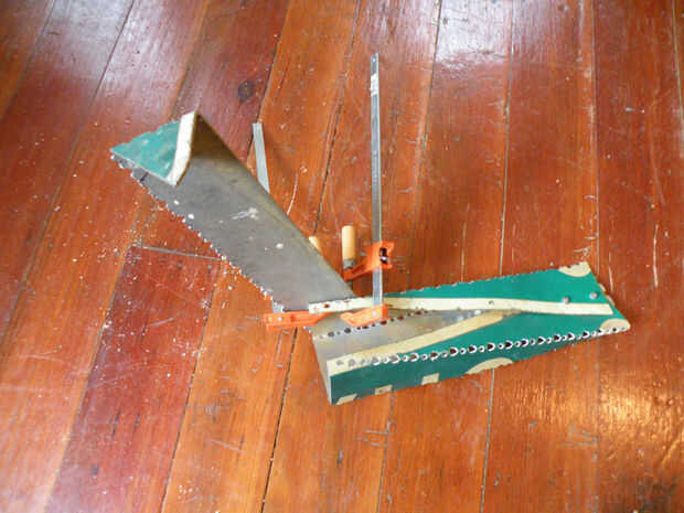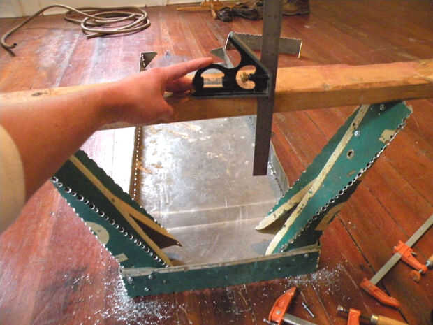 Mida una pendiente en las piezas laterales y marcar con un rotulador, como se muestra en la foto. Sujete en su lugar, perfore y apretar. Un nivel de ejecución (o en este caso, una 2 "x 4" con un combo pequeño cuadrado, porque no tengo un nivel largo) en la parte inferior de las piernas para asegurarse de que lo va a quedar plano cuando haya terminado.