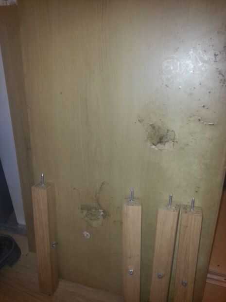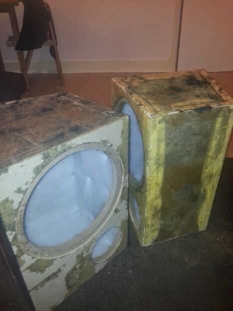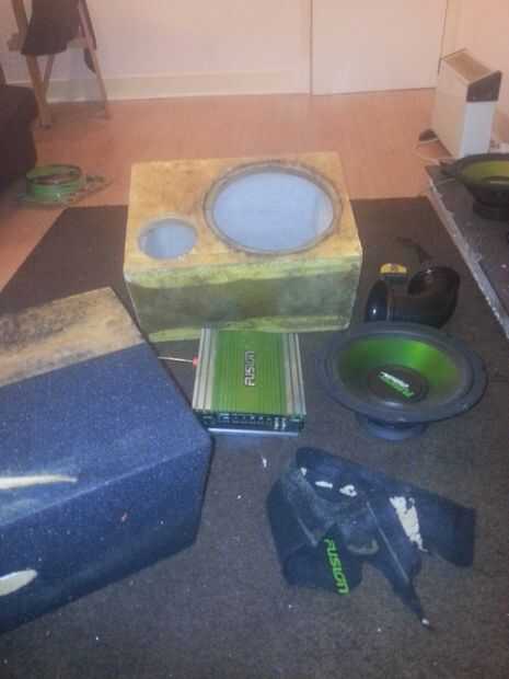Una mesa de Ikea desconsuelo, 2 subwoofers de coches y un amplificador de coche