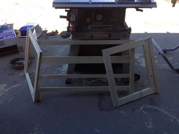 El siguiente paso es comenzar a recortar sus piezas, he usado 2 x 4 para las piernas. Son baratos y puede cortarlos a dimensiones de lo que desea. Luego cortar de 1 x 4 a 2 1/2" de ancho y cortar a la longitud. Después de cortar el 1 x 4 y 2 x 4, que montado en un esqueleto de la tabla.