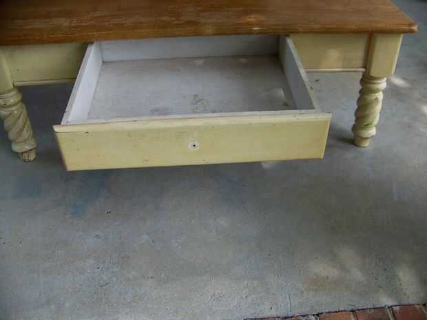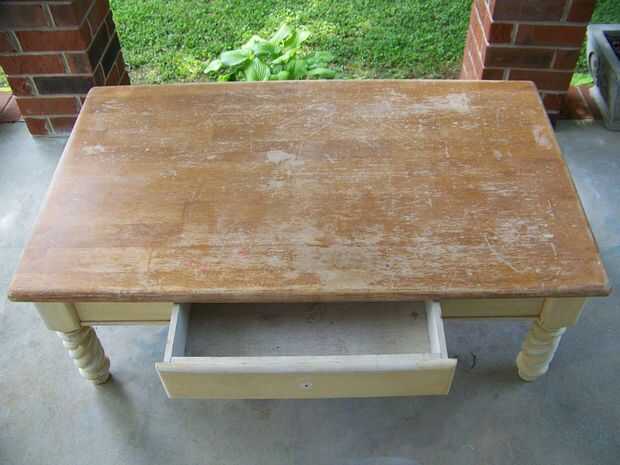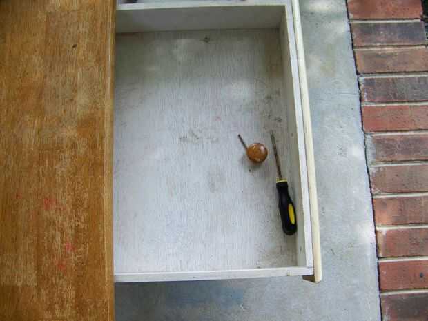 En primer lugar, retire el tirón de cajón por abrir el cajón y sacar el tornillo. Luego lijar la mesa para quitar arañazos ni lugares ásperos. Esto no tiene que ser perfecto! Arena tanto o tan poco como desee. Su propia expectativa es el único que tiene que cumplirse aquí! (Puede que también necesite utilizar madera masilla para rellenar cualquier abolladuras o golpes en la madera. Si usted necesita utilizar la masilla, permitir que la masilla seca y su mesa de arena otra vez.)