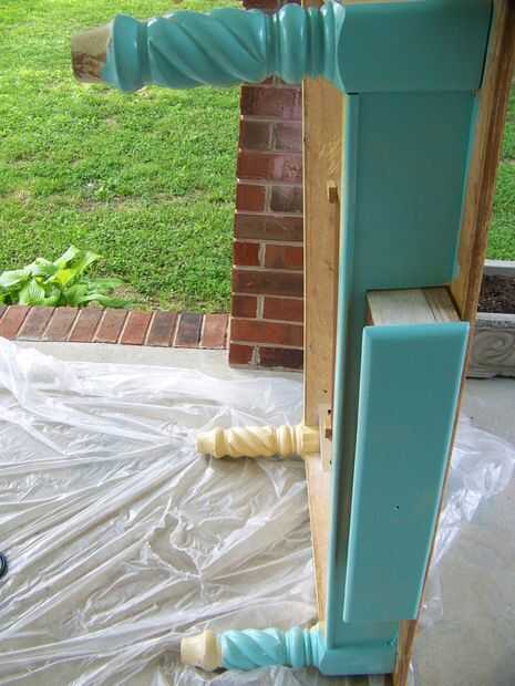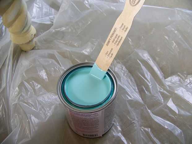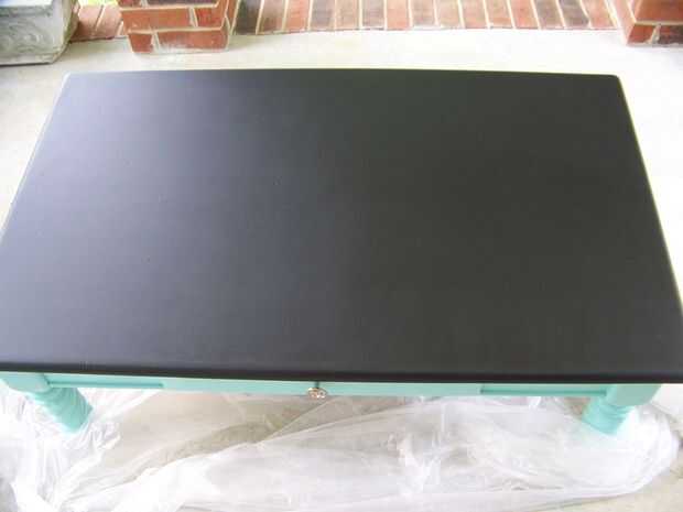 Ahora colocar el plástico para pintura no en todas partes. Revolver la pintura y mezclar bien. Todos de la mesa excepto la parte superior de la pintura y dejar secar. Puede que con unas cuantas capas de pintura. A continuación para mezclar la pintura de pizarra y pintar la parte superior, otra vez este proceso puede tardar unos abrigos! Después de que la pintura esté seca ponga el nuevo cajón tirando.