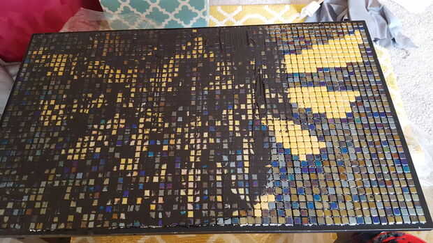 Aplique la lechada con el flotador, entrar en todos los espacios. Añadí la lechada a la frontera y había alisado en un ángulo forma cónica hacia abajo hacia el borde de la mesa.