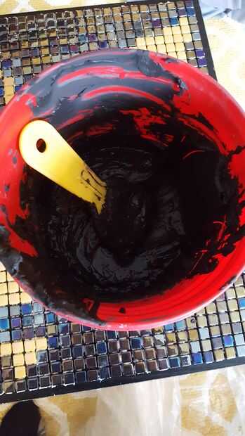 Mezcle la lechada según las indicaciones del paquete. Ya que no uso la bolsa entera, añadí agua hasta que era una pasta espesa. Revuelve con una espátula de plástico porque eso es lo que tenía. Si nunca has lechada antes, sugiero ver algunos videos de YouTube sobre cómo hacerlo! Este es el punto de no retorno, así que asegúrate de que estás seguro del método antes de comenzar.