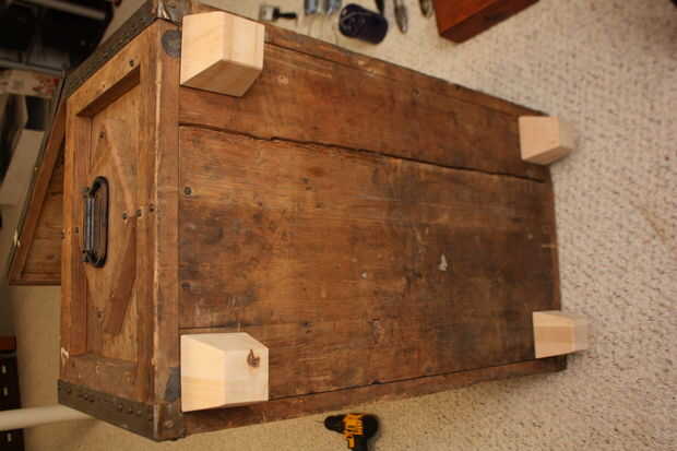 Había sido querer adjuntar pies a este pecho durante mucho tiempo. En mi antigua casa tenía suelos de madera y el latón en este cofre usado para arrastrar un poco y dejar arañazos.