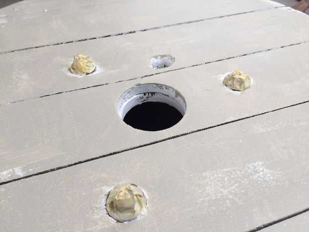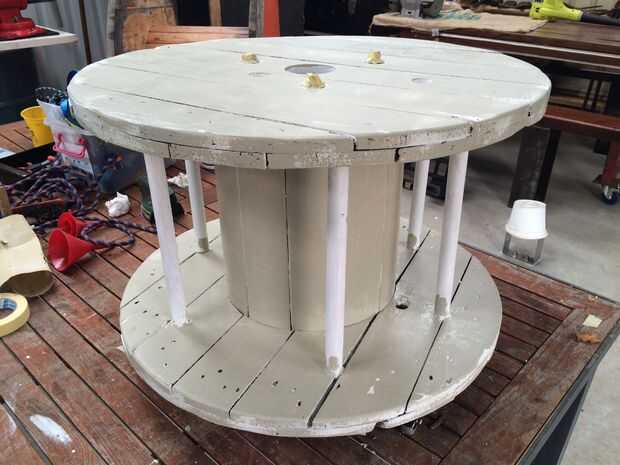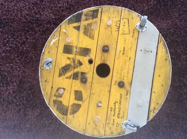 He utilizado una broca para perforar los agujeros en la parte inferior del tambor de cable y entonces simplemente había aprovechado las espigas a través hasta que llegan a la 'top'. Se sentían lo suficientemente apretadas como para no requerir asegurar en el otro extremo.