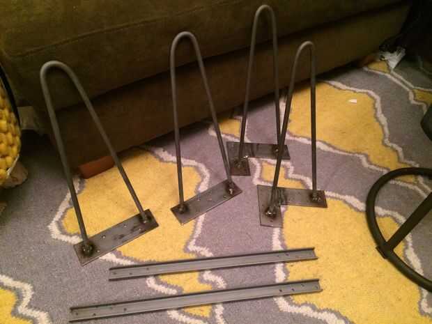 Compramos cuatro 36" longitudes de 3/8" acero redondo en la ferretería local. Luego doblar las piernas en la forma deseada y utilizar una amoladora para cortar los extremos de las patas a la longitud correcta y en un ángulo que permita las patas soldar muy bien a la placa de acero plana usada para montar las patas a la mesa.