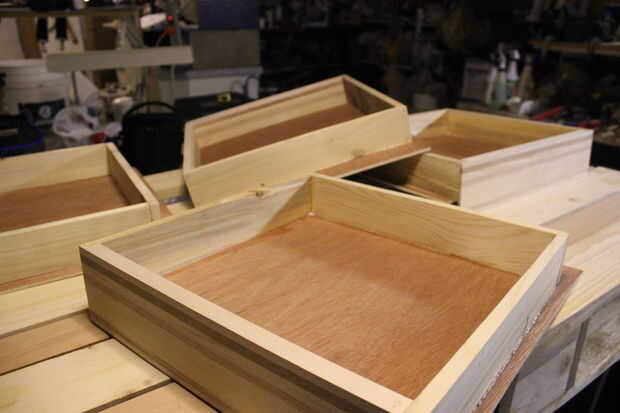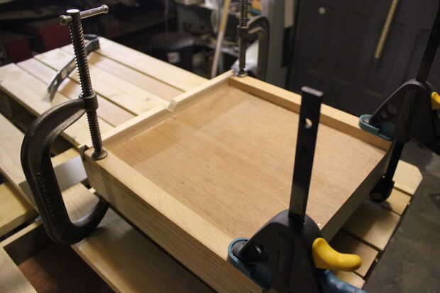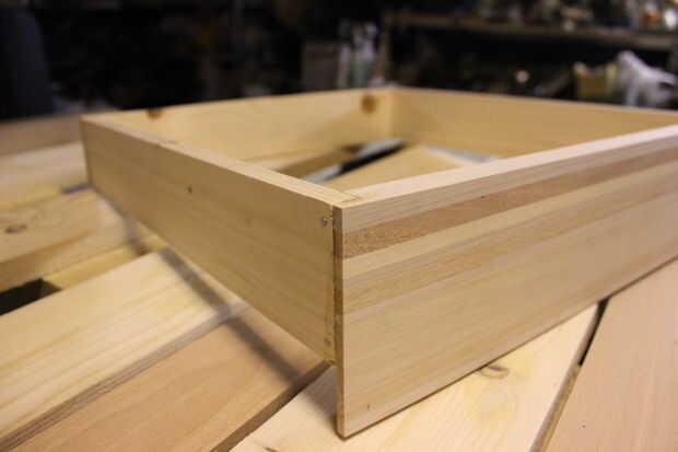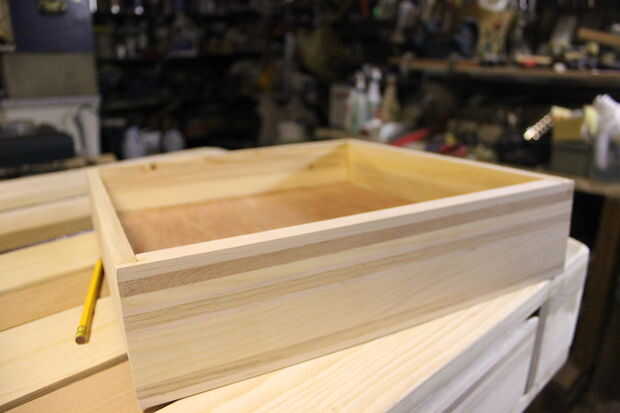 Para asegurarse de que son cuadrados, medir la diagonal de los cajones, deben ser iguales. Una vez seca, pegamento y clavo la parte inferior del cajón, y bastante listo!