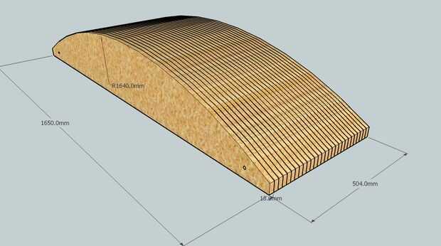 Hacer la primera para doblar las piernas. Lo más o menos algo como eso en la foto. El modelo de sketchup le dará una mejor idea. Debe ser de 1650mm cerca de 500mm de ancho y tiene un arco de radio 1640mm. El ideal es no lo construí, pero sólo usé en mano lo que era realmente. Las piezas anteriores eran de aglomerado 18 mm sin terminar en un zócalo y piel en MDF de 6mm. barra de espiga de 12mm fue utilizada para alinear las piezas. Vas a necesitar piezas de aglomerado idénticamente tamaño 28 o así si la haces de esta manera. Hice con 16 piezas anteriores con separadores entre ellas y luego la piel todo con MDF de 6mm después.