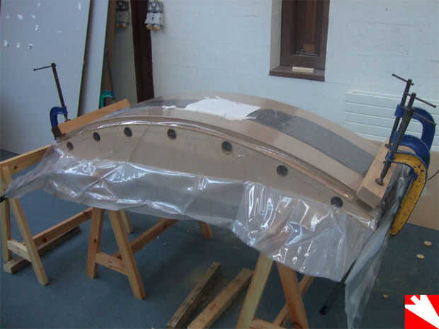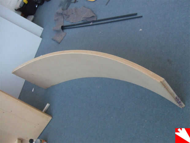 Si estás vacío embolsado le debe ahora con su ayudante Deslice el pegado encima de laminados en la bolsa y alinear lo mejor pueda para que los lados de los laminados son paralelos a los lados del anterior. Selle la bolsa, conecte la bomba de vacío y enciéndalo. Si su cualquier cosa como la que he usado podría ser media hora tirando el aire de la bolsa. Poner una barra en la mitad y Sujete temporalmente. Poner en la bolsa anterior también, pero otro método sería que los laminados en la bolsa y el lote encima de la anterior. No recuerdo la razón detrás de la manera que lo hizo. Puede haber sido porque la bolsa de la aspiradora era demasiado grande. De todos modos, a continuación puede espera y asegurarse de que la bolsa no consigue tirada los laminados. Tire de él hacia fuera rápido si lo hace, podría tener que dejar la bomba de vacío para hacer esto. Incluso con presión de vacío que nuestra bomba no podía tirar los laminados a la antigua así que tuvimos que utilizar abrazaderas y barras para bajar los extremos. Un punto super importante que me olvidé de mencionar es que algún tipo de tela en el bolso en la conexión de la manguera y por encima de tus piezas para ayudar a flujo de aire. 24 horas más tarde puede apagar el vacío abierto la bolsa y saque la primera pierna en blanco. Repita el procedimiento para obtener a su segundo.