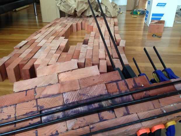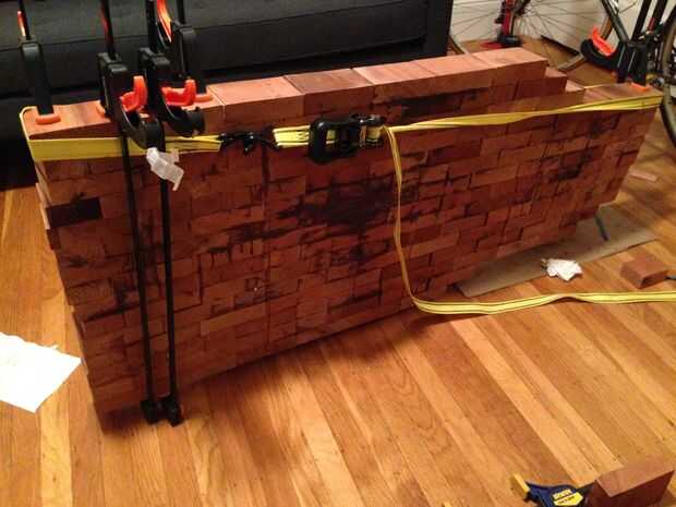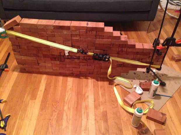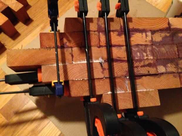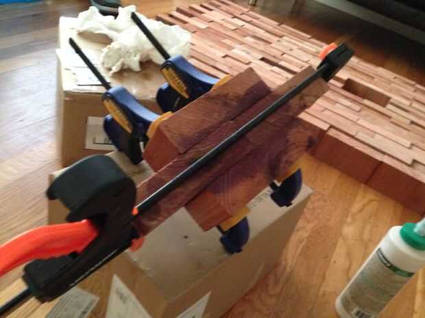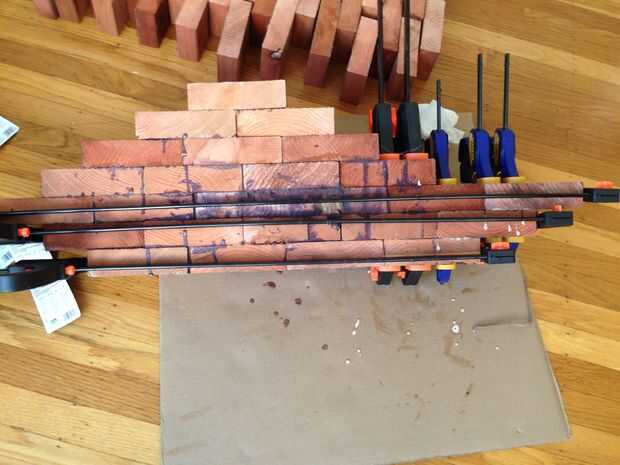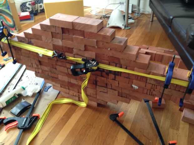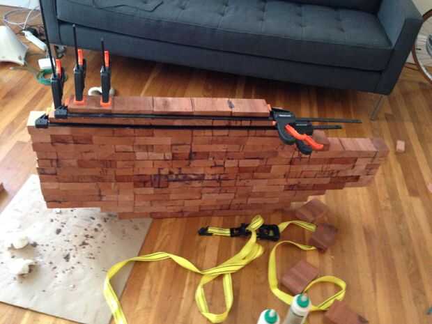 He puesto los ladrillos madera en mi piso para averiguar cuánto quería que la superficie que en lo referente a mi sofá. Una vez decidido empecé a pegar ladrillos por sujeción con pinzas de madera y cables de cinta. Fue un lento proceso tedioso para unir cada ladrillo. Ya que solo tengo 8 Pinzas de madera y una cinta cable - pegan ladrillos de 3-5 cada día. Esperando un día entre cada nueva sesión pegado. Comencé pegando desde el centro y se movió hacia fuera (en forma de diamante), para asegurar cada madera pieza podría estar tan juntos como sea posible. Pegar filas no trabajo puesto que no ser perfectamente plano y así causaría grandes vacíos en la superficie de las tablas. La marca del pegamento que usé era Titebond III - Ultimate Wood Glue.