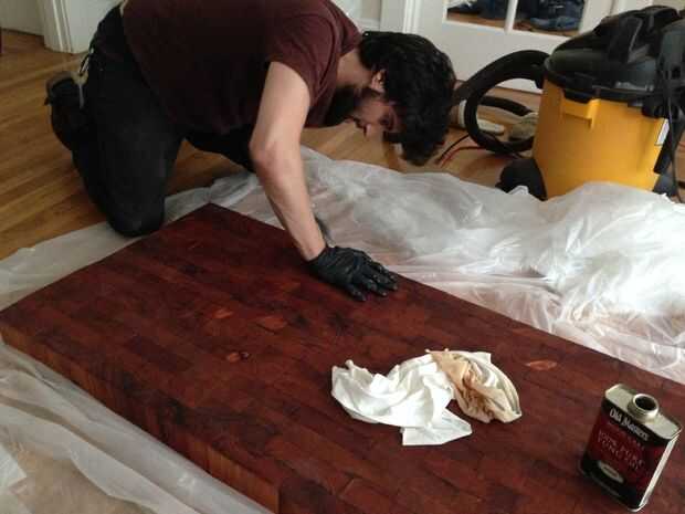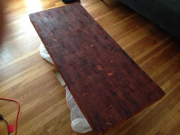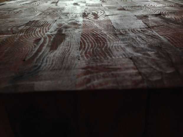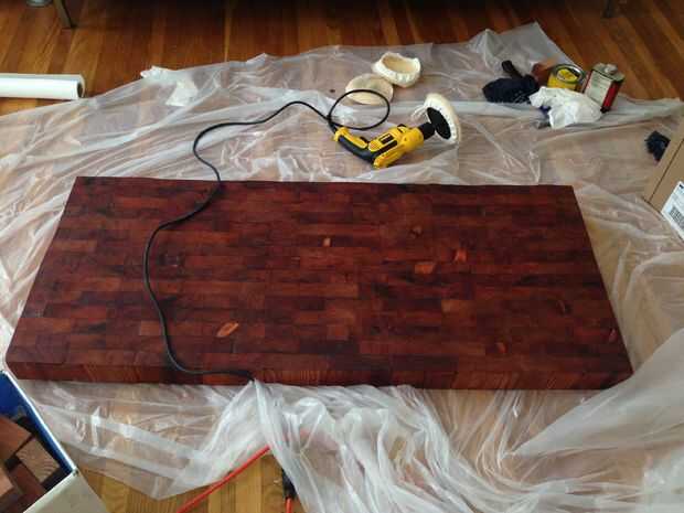 Utilicé aceite de Tung en la superficie. He utilizado dos capas esperando un día entre cada capa. El aceite de Tung oscureció la secoya sin cualquier mancha es necesitada. Después de dejar que el aceite seco, he añadido cera (http://www.amazon.com/dp/B000LNOZAW/ref=pe_385040_30332190_TE_M3T1_ST1_dp_1) a la superficie para proteger la madera. Originalmente trató de cera a mano, pero se dio cuenta de que requiere un montón de pulido para conseguir una mirada brillante. Para esto, compré un poco que pude conectar a mi taladro para pulir hacia fuera.