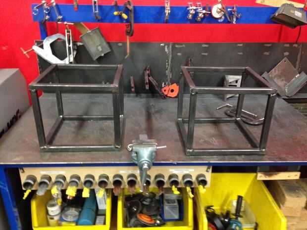 Utilicé un soldador MIG para unir las piezas de metal. Usé amoladora para luego suavizar mi feo trabajo de soldadura. Por último, trajo los cubos a una instalación de recubrimiento de polvo cerca de mi casa y tenía cubierto por 40 $.