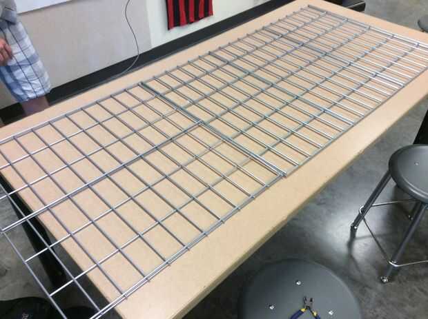 Coloque la cubierta de alambre de 35 3/4 "× 24" plano con los travesaños de 35 3/4" levantado hacia abajo (cuando la vuelta se enfrentará). Luego coloque una cubierta de alambre de 22 "× 23 1/2" a cada extremo de la cubierta más grande de alambre con bridas. Asegúrese de dejar los amarres de cable asegurados libremente.