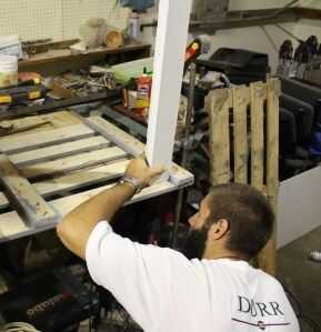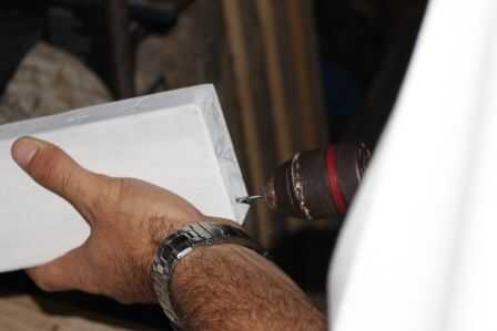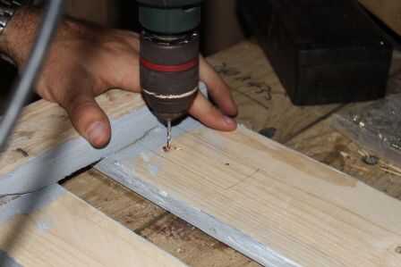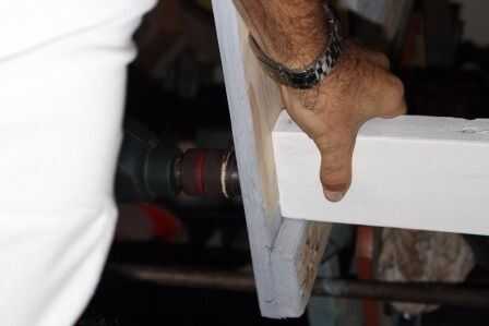 Ahora por fin puede empezar la Asamblea, esto es probablemente la parte más fácil de todo el proyecto, ahora está todo listo para solo poner juntos. Todo lo que necesitaba ahora precisión al marcar. Tan a medida que las piernas deben ir que les trazó en posición en la parte inferior de la superficie superior. Luego marqué donde quiero que mis agujeros y perforé ellos, cuidado de no ir a rápido puede frenar entonces hacia fuera en el otro lado. Luego coloca las piernas sobre la mesa y perforado por los agujeros en las patas para hacer un punto, luego seguí perforar las piernas lo suficientemente profundas luego. En la uno imagen puede ver el método que utilizo para recordar que la pierna va donde, número la posición de la pierna con el mismo número y darme un punto de referencia que no se olvide que inversa es supongo para ir.