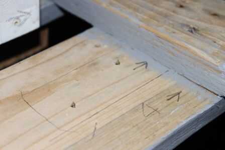 mesa de centro de plataforma de patrón de Chevron.Paso 1: empecé con un 2' x 4' 3/4" madera contrachapada. Encontré el centro de esa madera, longitudinalmente y pegado y brad clavado un palo de 1/2 "x 1/2" hacia abajo en el centro para romp