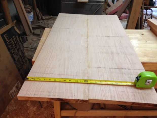 El tablero que utiliza para la parte superior era un 12-1/2 "X 9' largo roble rojo por la mitad. Mi problema con el diseño era el espacio. La razón de la doble tabla propuesta era para ahorrar espacio y basado en las mediciones, la mesa debe ser de 17"- 18" alto mientras que la mesa del comedor debe ser por lo menos 29" de alta. Por lo tanto, la longitud mínima de la tabla tenía que ser 58" de largo. Medición de la anchura se basó en la sala de brazo, un plato y una taza al lado.