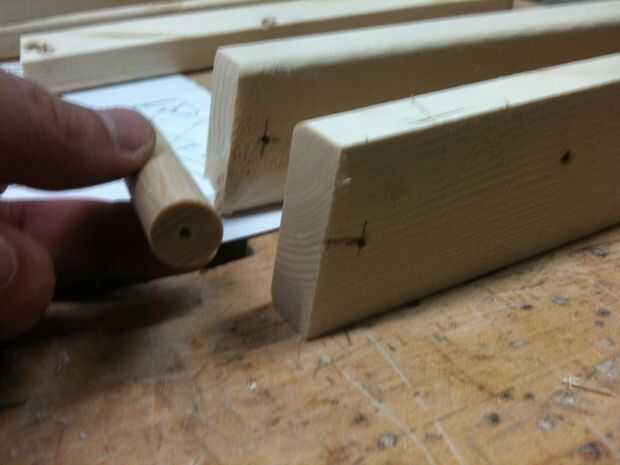 Otra vez 8 piezas de madera 2 "x 1", ahora de 11" de largo. Perfore agujeros en el centro, 1" de cada extremo.
