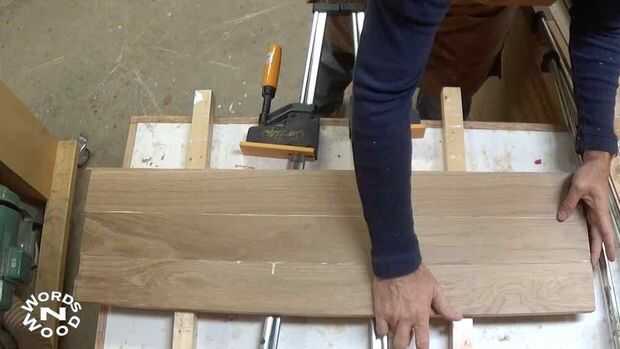 Elegí tres peces para el grano y color y había pegado hasta hacer el estante superior. Repetí eso (con dos piezas) para el estante inferior más estrecho. Entonces podía mover para preparar el caldo de patas, largueros y rieles largos.