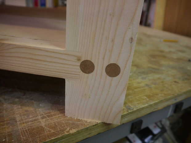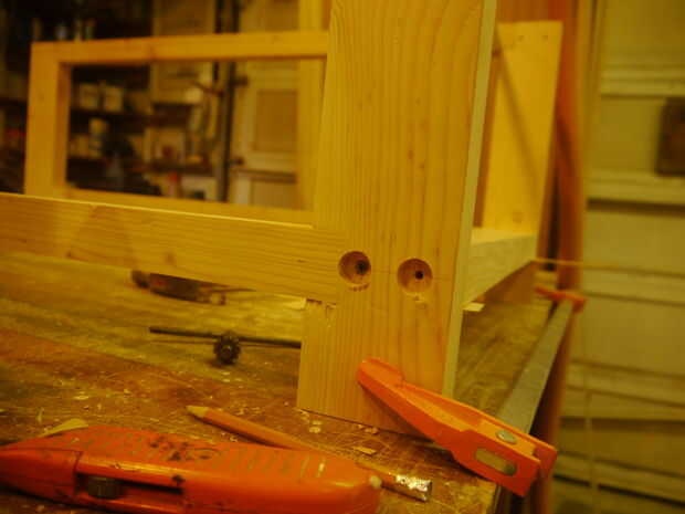 Nos avellanado el los tornillos con un 5/8" forstner bit, luego agujeros a través de las piernas. Y usados de 3" tornillos para unir el marco. Cortar los tapones para los orificios de la cubeta con un cortador de enchufe de 5/8". Nuestros conectores están hechos de algunos burl de redwood que tuve mentira alrededor de la tienda. Usé bloques y cuñas para sostener los travesaños a la altura correcta.