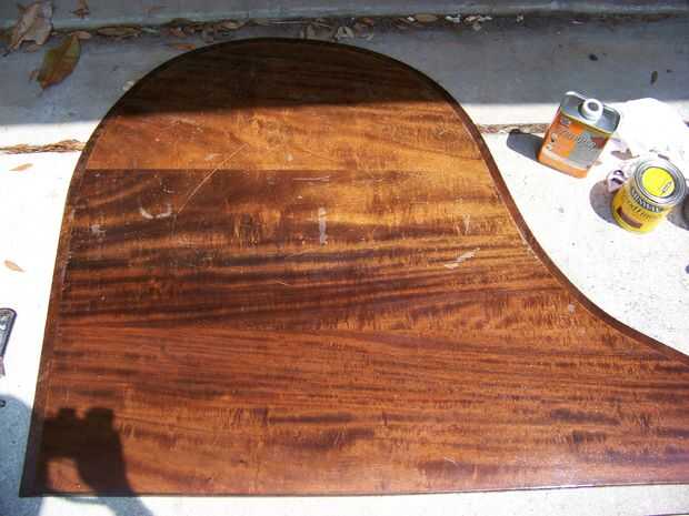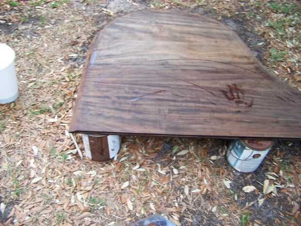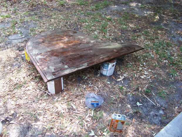 Aplicar el separador como se indica en la lata. Poner lo que plan sobre el uso de un metal puede luego aplicarlo a la mesa y cepillar en la en la dirección de la veta de la madera. Dejar reposar por 15 minutos y luego utilizar la herramienta de rasqueta de plástico en la dirección de la veta de la madera para eliminar las incrustaciones gruesas. Si utiliza un raspador de metal que pueda rayar la madera. Una vez que tengas el goopy cosas desagradables sobre todo quitado entonces use los espíritus minerales para limpiar el exceso stripper.