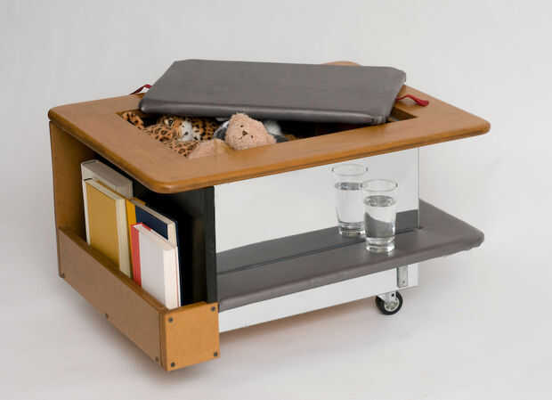 sabes esas personas molestas que hacen todo a la vez? Bueno, esta mesa tiene la misma personalidad. Lo hace todo. Mesa de centro, el resto del pie, sostenedor de cristal, revistero y unidad de almacenamiento. Todas las funciones están separadas. No me gusta ver pilas de revistas y libros sobre la mesa, por lo que proporciona una rejilla en el lado. Bordes redondeados y una parte superior suave ofrecen un descanso para pies cansados, pero ya no mezclan bebidas y pies, diseñé una plataforma protegida que envuelve alrededor de la mesa y guarda sus bebidas fuera de peligro. Por último, ya que soy un habitante del apartamento de la ciudad y el espacio es una prima no puedo pagar tener cualquier pieza de mobiliario que no duplicar como almacenamiento, por lo tanto, la parte superior desmontable.