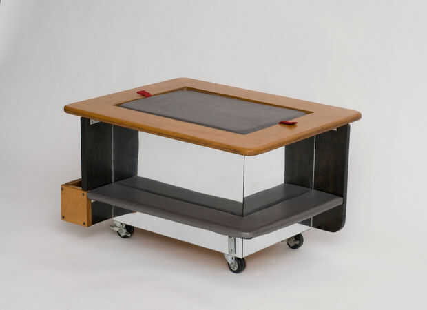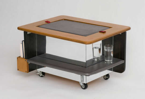 Las características adicionales incluyen ruedas, para facilitar la limpieza, y dos espejan laterales que sirven para reducir la masa visual de la pieza y para entretener a cualquier bebés que pueden gatear alrededor. En ocasiones cuando esos bebés crecen podría volcar todo el contenido de la tabla de café en el piso, subir en él y convertirlo en un coche de carreras, creando caos. Esta función debe ser desalentada. Después de todo, es sólo una mesa de café.
