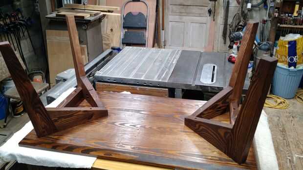 mi primer camino que quería quitar los tornillos y taladro para largos tacos en las patas para delantales... pero después de ver a todos mis tacos largos para mi sorpresa tenía ningún 1/2 '' o 3/8 '' dije diablos consigo a cortar algunos enchufes y esconder los tornillos y espero que no caiga aparte las espigas... jajaja pero que resultó para ser bastante fuerte estaba parado en él y rebotó y sentado en ella para poner mis botas en la mañana... la última foto es atornillado a la parte superior y lo manchado y poner una capa de paño en poli en la parte inferior...