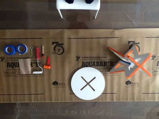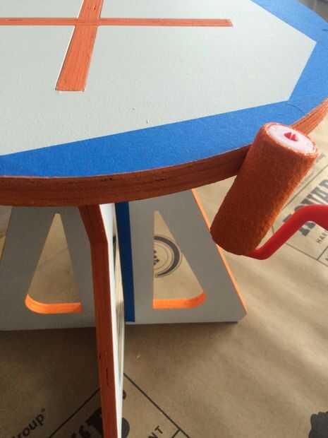 Casi el último paso del proceso es la pintura de las partes. Usé cinta de pintor azul para la máscara de los bordes y los mini rodillos para aplicar la pintura. Podría trabajar en cualquier combinación de colores. Mi objetivo es resaltar la forma de X sobre la mesa. Usé un acento naranja color blanco y base