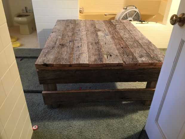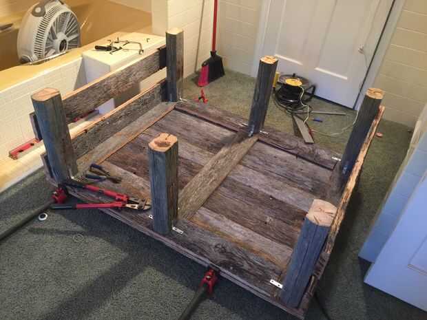 Los dos lados más cortos de la mesa tenían dos tableros (42") separaron 3 ¼" apart y asegurada para dos puestos. Los dos lados más largos tenían asegurados a las tres patas, pero en el interior de tableros. Lo hice para mantener a la mitad de la tabla abierta por lo que la gente podría poner sus piernas por debajo de ella cuando se está sentado en el sofá o el suelo. Estas dos tablas eran principalmente mantener todas las patas de la mesa rectas, seguras y añadidas las cargas de apoyo general.
