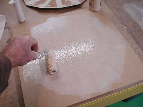 Cuando estés listo, aplique una cantidad abundante de pegamento para el sustrato. No Aplique pegamento a tu círculo chapado como las carillas se encrespan y va a ser difíciles, si no imposible trabajar con. Es mejor usar un rodillo perchado corto para aplicar el pegamento uniformemente sobre toda la superficie de su sustrato. Una gruesa acumulación en solamente una área causará la chapa a encoger mientras presiona – una capa uniforme es una necesidad! Una vez aplicado el pegamento, coloca tu círculo chapado, lado de la cinta, sobre el sustrato pegado. Alinear la chapa por lo que ninguna proyección.