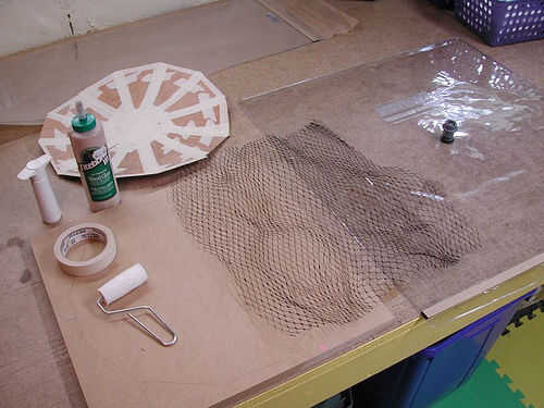 Es tiempo de preparar su espacio de trabajo. Tiene todas las piezas listas, incluyendo el pegamento, chapa, rodillo, el bolso de vacío del fino aire presiona, malla de ventilación y por último, la bomba de vacío manual. Configurar todo para estar a mano cuando comience su cola para arriba como usted ha limitado tiempo para aplicar el pegamento antes de que empiece a secar.