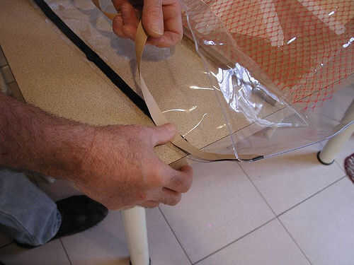 El siguiente paso es pelar el papel de la cinta de cierre y tire firmemente a ambos lados de la bolsa de grifo, que se extiende la bolsa plana a lo largo de la cinta de sellado. Tome su dedo y presione con cuidado el precinto a la bolsa de grifo de vinilo. Como lo hace esta trato de trabajar desde el interior de la bolsa hacia el exterior. Busque cualquier luz áreas coloreadas donde la cinta no se presiona firmemente hacia abajo. Estos serán muy visibles y sólo necesita un poco pulgar presión para eliminarlos.