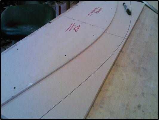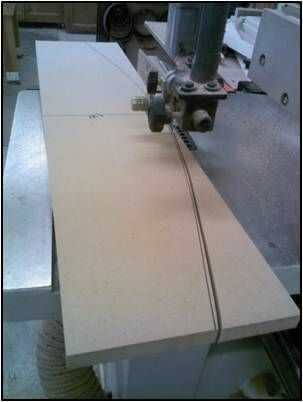 Con la Sierra de cinta corte la curva de 1/16" fuera de la línea trazada en los tres cortes MDF.