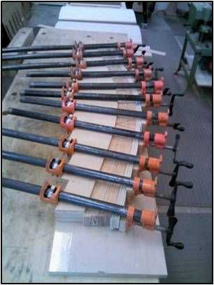 He utilizado 20 1/8 "x 1 ¾" x 48" tiras de madera contrachapada como un caul sujeción de flexión. También usé un ¾ "x 1 ¾" bloque cuadrado de MDF en la cabeza de cada mordaza a aplicar una presión igual a lo largo de la forma. Asegúrese de mantener la parte superior de las tiras planas.