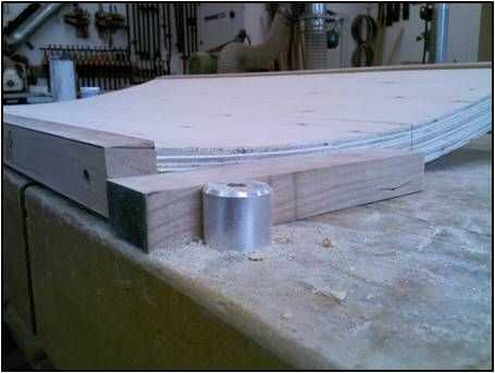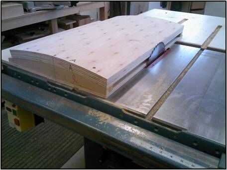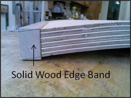 Para aplicar las bandas de borde, el ancho de la base es recortado a 17" y corte en 90 grados. Una tabla vio jig se realiza utilizando la misma plantilla que se utilizó para hacer el pedestal en forma de flexión. La plantilla utiliza la ranura de inglete de la Sierra de mesa. Registro y alineación cuidadosa es esencial.