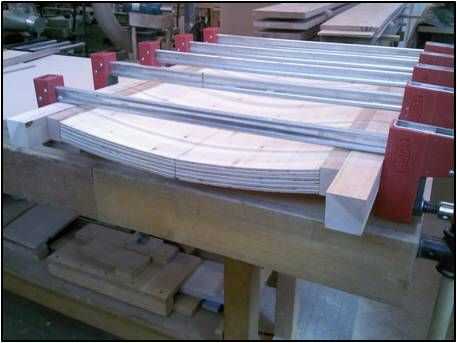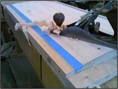 Uso de planos para eliminar los residuos y el nivel de la mano el borde para que se amolde a la curva de la base. Las bandas de borde deben estar nivelado a las superficies de la base. La cinta de enmascarar azul sirve como una guía de cepillado para no cortar el núcleo.