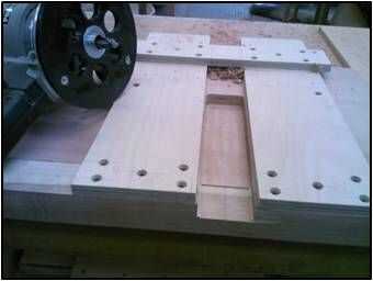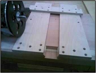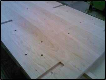 Se hace una plantilla de ½" Appleply. La plantilla se une a la parte inferior de la tabla con tornillos para madera para ser ocultada por los soportes de largo.