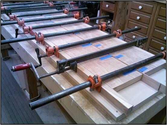 Los bordes tienen una costura donde se pegan las dos piezas de madera. Para ocultar esta costura pegué una tira fina de chapa de madera a los bordes de ambas extensiones laterales. Una vez seco el pegamento usé un plano de la mano para quitar el excedente.