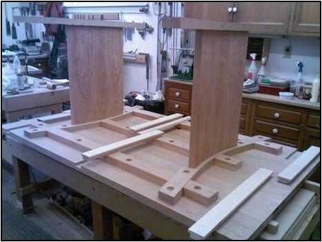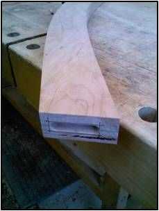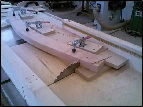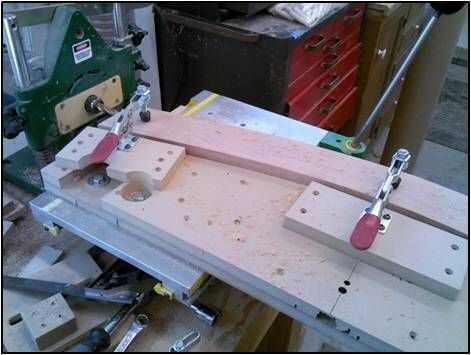 Alinee la línea de centro de la camilla a la línea central de la plantilla que se utilizan para cortar las juntas de vuelta la mitad de los travesaños curvos.