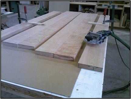 Usando una ensambladora de cada borde se unió a cuadrado y luego mano planeado para quitar las marcas de la ensambladora. Esto reduce el ancho a 7".