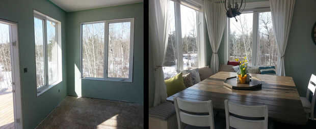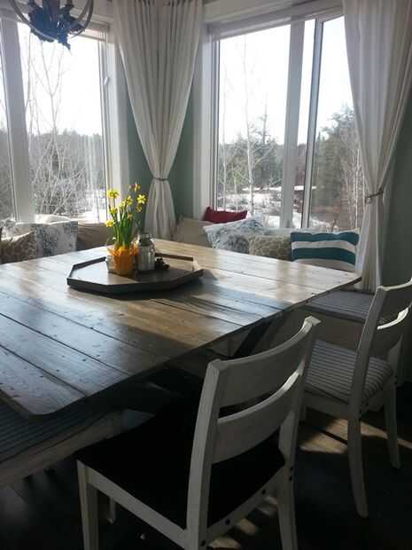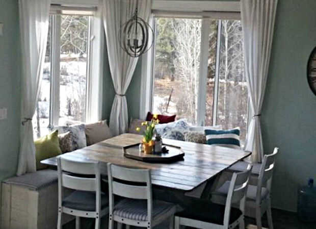 Llegamos a casa desde el extranjero y construido una casa. Con sin muebles y sin dinero para comprar cosas nuevas para una nueva casa, aquí es lo que hicimos para nuestro comedor. Barnwood repurposed, tablones de techo, trozos de madera, un sobrecolchón y algunas cortinas de baño y tenemos un gran rincón poco comedor que puede acoger cómodamente doce (y almacenamiento de información para mis hortalizas de raíz y otros artículos)