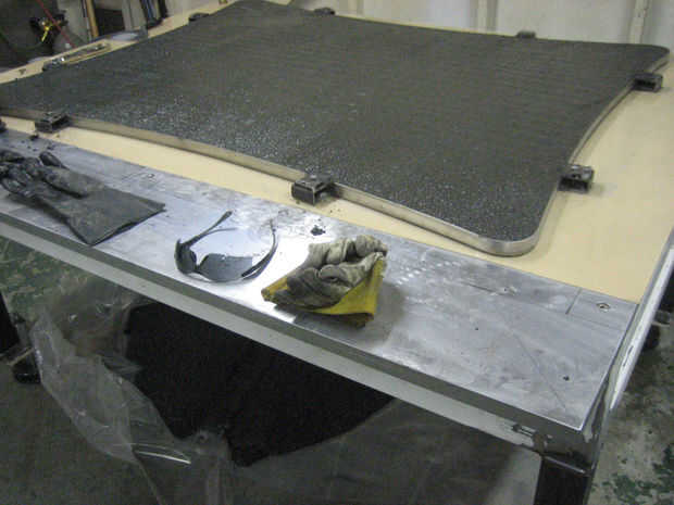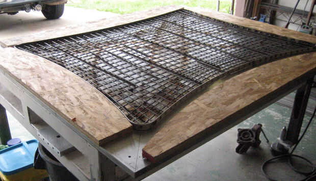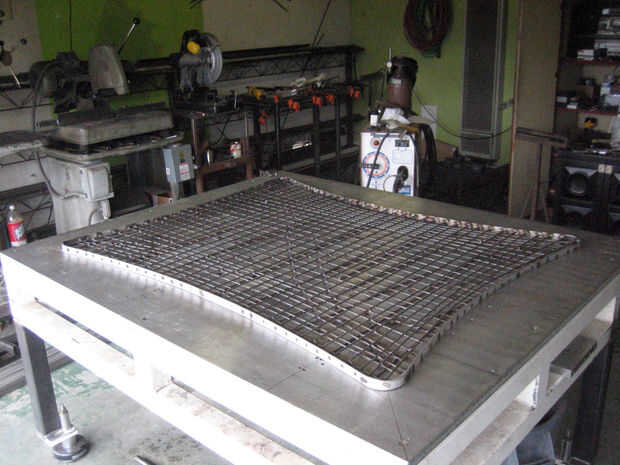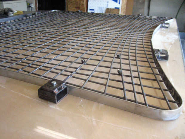 El refuerzo consiste en 3/16" frío barra redonda de acero de aproximadamente 2" centros en dos direcciones. Cada ronda bar esquina es soldado con autógena. También los extremos de éstos están soldados para el acero inoxidable barra plana de borde de la mesa.