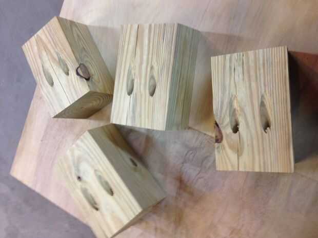 Cortar 4 tramos de 4 x 4 de longitud de 8", con un extremo ángulo de 10 grados. Luego encolados y atornillados los soportes debajo de las tablas de pan, como se muestra en la imagen final.