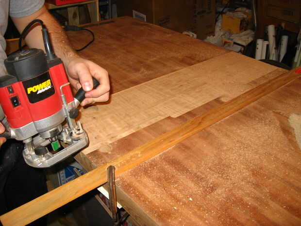 5 - en la sección central de la puerta, trace un área rectangular. Esta zona necesita cubrir los agujeros del mango. Con un router, quitar una capa delgada de madera – 1/32 o 1/16" de espesor. El espesor se refiere a la hoja de metal que vamos a usar. Usted tendrá que quitar esta capa en la parte superior y cada lado de la puerta donde estará la hoja de metal. Planeado para cubrir los agujeros de la manija y cerradura con una hoja de metal. Usted podría elegir una estrategia diferente o material.