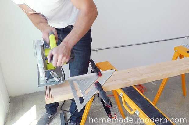 Usé los pedazos de dos desecho de ángulo de hierro para ajustar la altura de la cuchilla en mi sierra circular a exactamente 3/16". Luego fija un cuadrado de la velocidad a la 2 x 6 para servir como una guía y realiza una serie de cortes para crear una hendidura que permitiría que los hierros de ángulo para sentarse a ras.