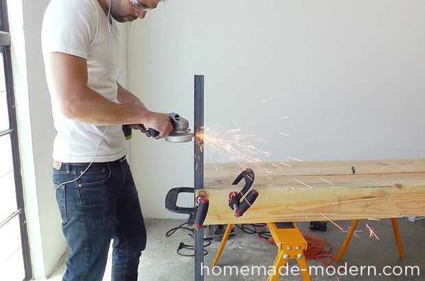 Fijar el hierro de ángulo entre dos de los 2x6s y corte con mi amoladora angular de 18 voltios. Utilicé un disco de corte abrasivo para esta tarea.